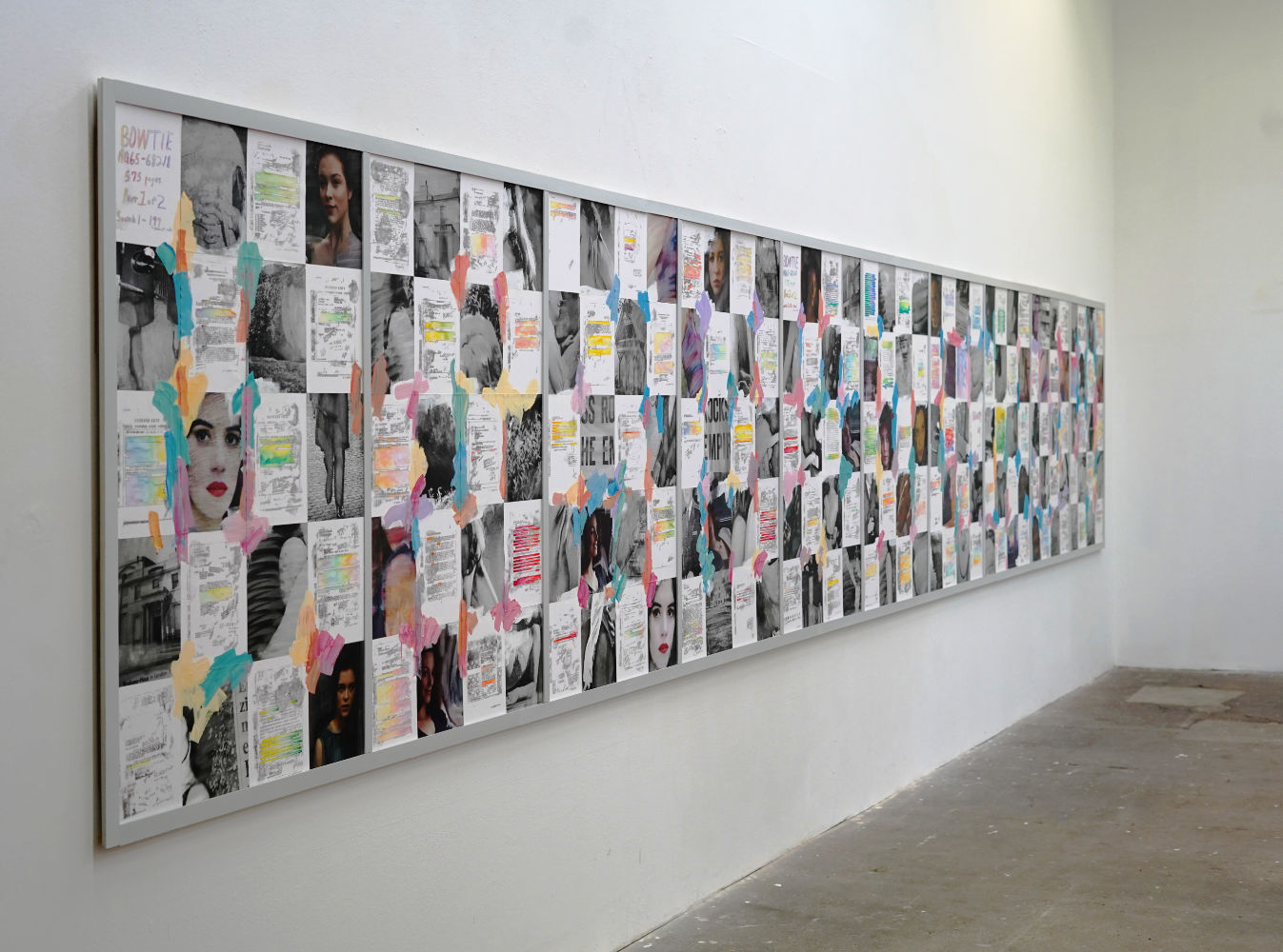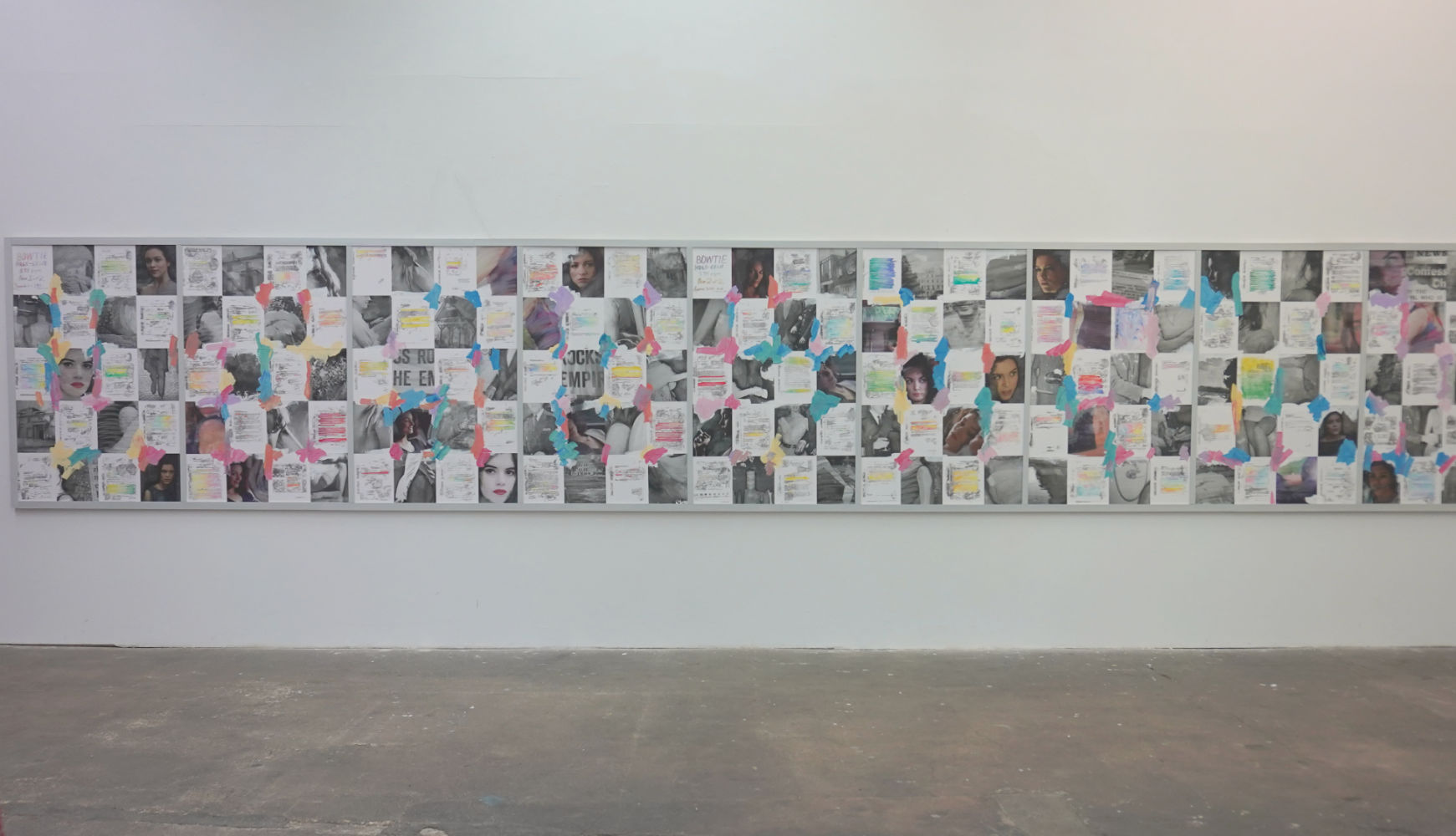 On a large picture consisting of ten panels, I have reworked the secret service documents concerning the socalled Profumo-affair. Many passages are blacked out, and I have made these parts colourful. In between are fragments of press photos. The faces of young women are those of actresses who played Christine Keeler in films and television series: Scandal (1988), the series "The Crown" and "The Trials of Christine Keeler" (2017). Stagings and pictorial evidence are balanced here with secrets and the tabloid press. Brushstrokes are on made on top, gestures of artist practice, showing another a layer of time.