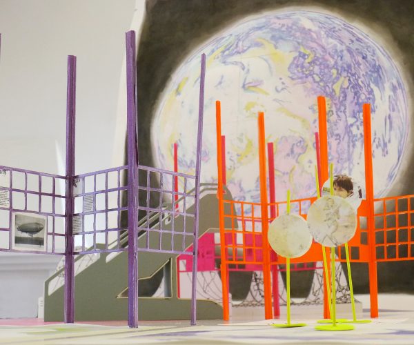 Ein Strudel hat die korallenroten Ruder aus dem Kurs gerissen, das ist der Mälström. Diese Skulptur wendet die Gestaltungsformen einer Raumzeichnung an, wie ich sie auch bei Figuren wie der Friedung oder Krupke eingesetzt habe. Bei diesen dreidimesional zusammengesetzten Linien kommen zu den formalen erzählerische Elemente hinzu: Die Skulpturen sind zusammengesetzt aus Gegenständen, die Geschichten nahelegen.