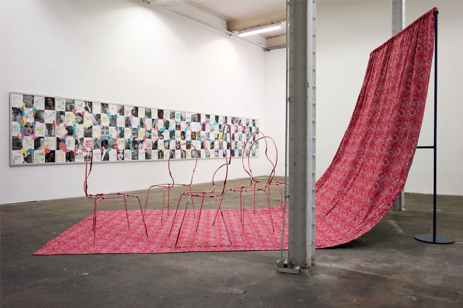 Ich habe den Designer-Stuhl durchsichtig gemacht, und die Formen sich verdrehen lassen, Die Variationen tanzen im Sitzen. Der Fotohintergrund, sonst so neutral, wie es eben geht, ist eine Stoffbahn. mit einem Paisley-Muster bedruckt ist – ein Dekor, das in der Zeit des Swinging London in den 1960er besonders populär war.